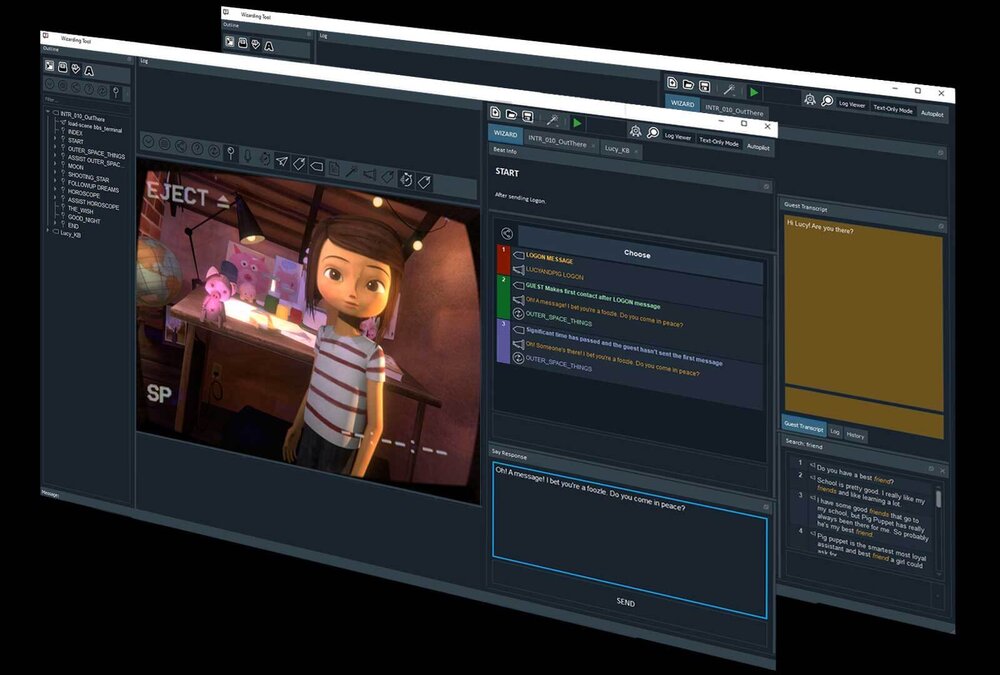 This resulted in an amazing tour of technologies like Resemble.ai, SpiritAI, SpeechGraphics, DungeonAI, Replika, and many many more. The team then embarked on creating a suite of tools for driving Lucy during interactive chat sessions with her, for example a Google Hangout, or playing Minecraft with her over Twitch. Essentially creating a test bench from which new technologies could be plugged in and out to explore automating different parts of the character.
